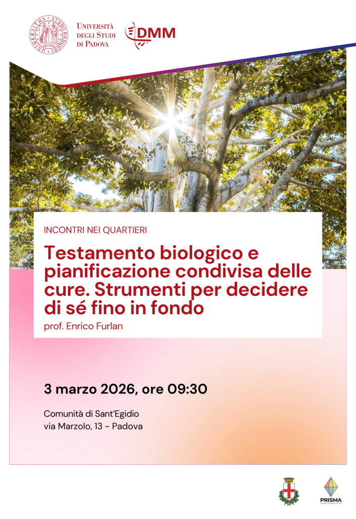 Molti cittadini, quando pensano alla fase finale della propria vita, sono preoccupati perché temono di non poter più decidere per sé o di ricevere trattamenti non coerenti con la propria immagine di vita dignitosa. Esistono però alcuni strumenti legislativi pensati per favorire la relazione tra curanti. e paziente, e per proteggere la volontà informata dei cittadini. Si tratta delle Disposizioni Anticipate di Trattamento (DAT o testamento biologico) e della Pianificazione Condivisa delle Cure (PCC). Il 3 marzo 2026 con il Prof. Enrico Furlan si discuteranno caratteristiche e limiti di ciascuno strumento e si spiegherà quando e come redigerli. Saranno inoltre discussi dubbi o domande dei partecipanti.